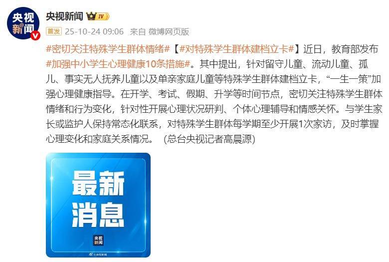 其中还提议,针对留守儿童、流动儿童、孤儿、事实无东说念主赡养儿童以及单亲家庭儿童等稀疏学生群体建档立卡,“一世一策”加强神色健康率领。在开学、测验、假期、升学等时期节点,密切关注稀疏学生群体心绪和步履变化,针对性开展神色情状研判、个体神色提醒和情感关怀。与学生家长或监护东说念主保持常态化策划,对稀疏学生群体每学期至少开展1次家访,实时掌抓神色变化和家庭关系情况。