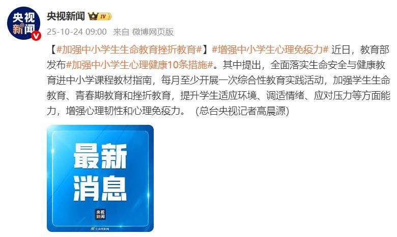 10月24日,据央视新闻音尘:近日,评释部发布加强中小学生神色健康10条门径。其中提议,全面落实生命安全与健康评释进中小学课程课本指南,每月至少开展一次抽象性评释实践行动,加强学生生命评释、芳华期评释和贫寒评释,晋升学生适当环境、调适心绪、打发压力等方面智力,增强神色韧性和神色免疫力