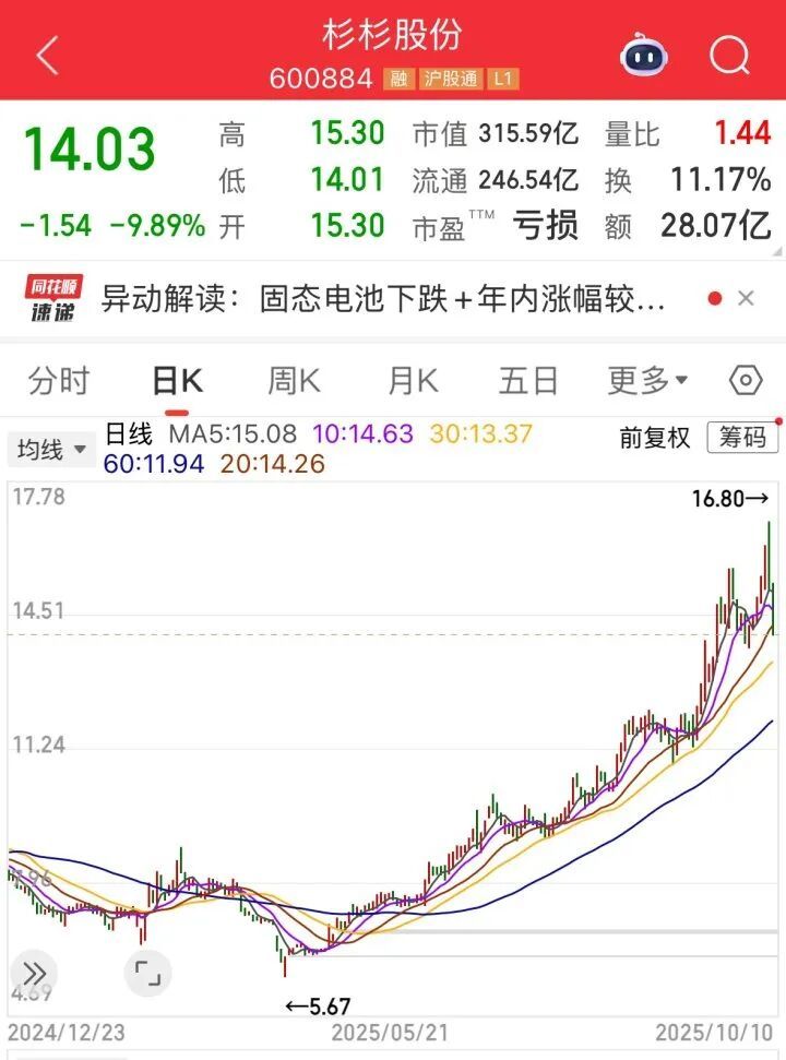 国庆长假后的首个来昔时,杉杉股份跌2.08%。今天(10月10日),受固态电板板块举座调遣等身分的影响,股价大跌9.89%,收盘报价14.03元/股,面前市值316亿元。