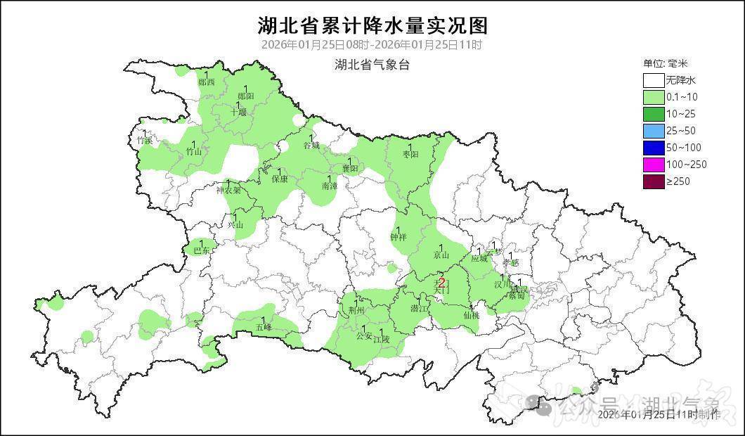 湖北日报讯(记者曾莉)雨雪降温又来了!1月25日,湖北省最低气温均守护在0℃以上,大部地区气温在2℃至8℃之间,十堰、恩施等地出现大雾天气,其中竹山、郧西、郧阳等区域浓雾。受弱冷空气影响,湖北上空云层显着增厚,上昼中西部多地已出现弱降水。