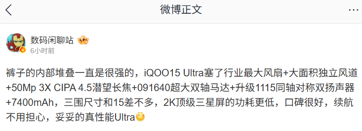 据博主 @数码座谈站 的爆料,iQOO 15 Ultra 塞了行业最大电扇 + 大面积平安风谈 +50Mp 3X CIPA 4.5 潜望长焦 +091640 超大双轴马达 + 升级 1115 同轴对称双扬声器 +7400mAh 电板,三围尺寸和 15 差未几,2K 顶级三星屏的功耗更低。