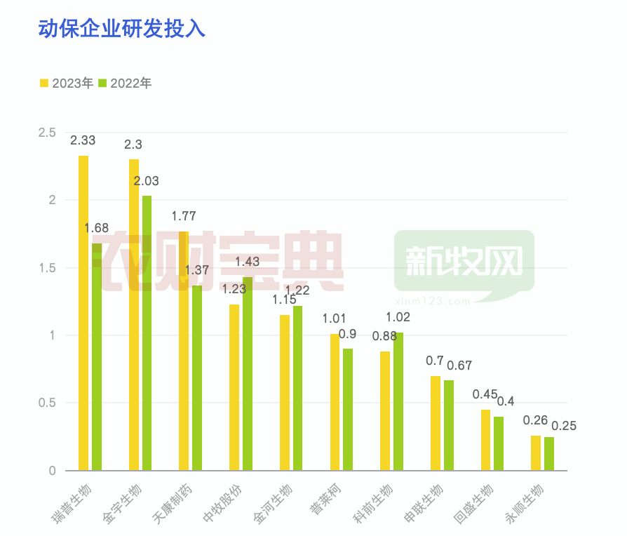 研发是动保企业保持竞争力的要津。2023年动保企业研发过问排行发生了一定变化,瑞普生物以2.33亿元成为当年研发过问最多的企业。天康生物以1.77亿元排行第三,金宇生物以2.3亿元排行第二。