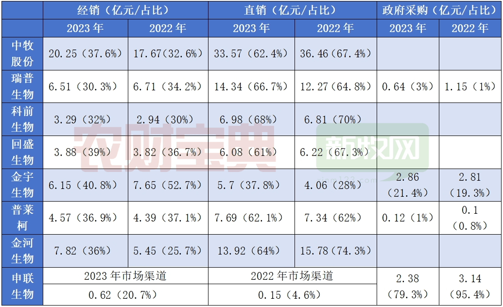当今,包括中牧、瑞普、科前、回盛、普莱柯、金河在内的多家企业直销营收均高于经销。